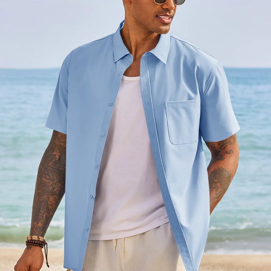 Design: Classic solid-color aesthetic with a functional chest pocket and button-front closure.