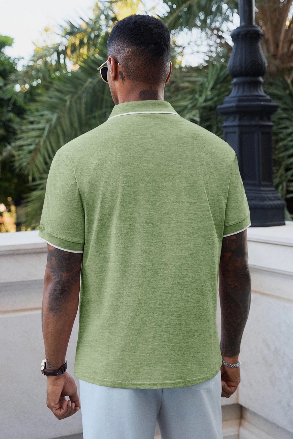Contrast color splicing on collar and cuffs adds subtle visual interest to the classic polo silhouette.