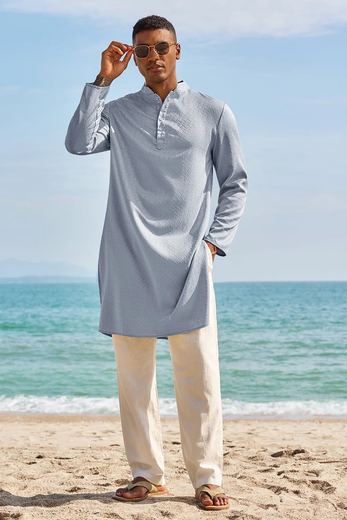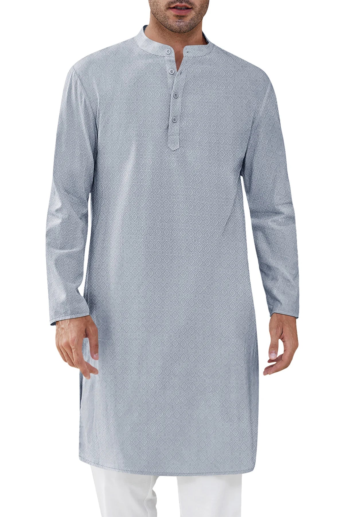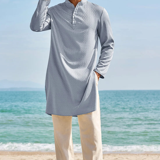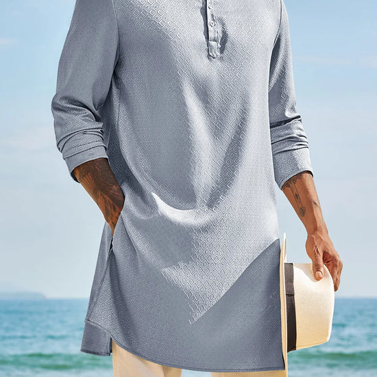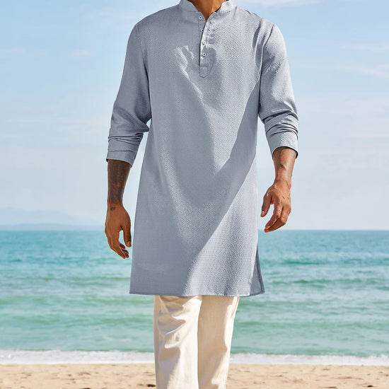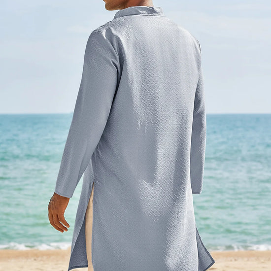 Elevate your wardrobe with Runcati Men’s Long Sleeve Kaftan Robe—blending traditional charm with contemporary comfort. This textured thobe features a Henley neck, banded collar, and loose fit, paired with side splits and knee length for ease of movement. Crafted from 98% polyester and 2% elastane, it’s soft, breathable, and lightweight, ideal for year-round wear.