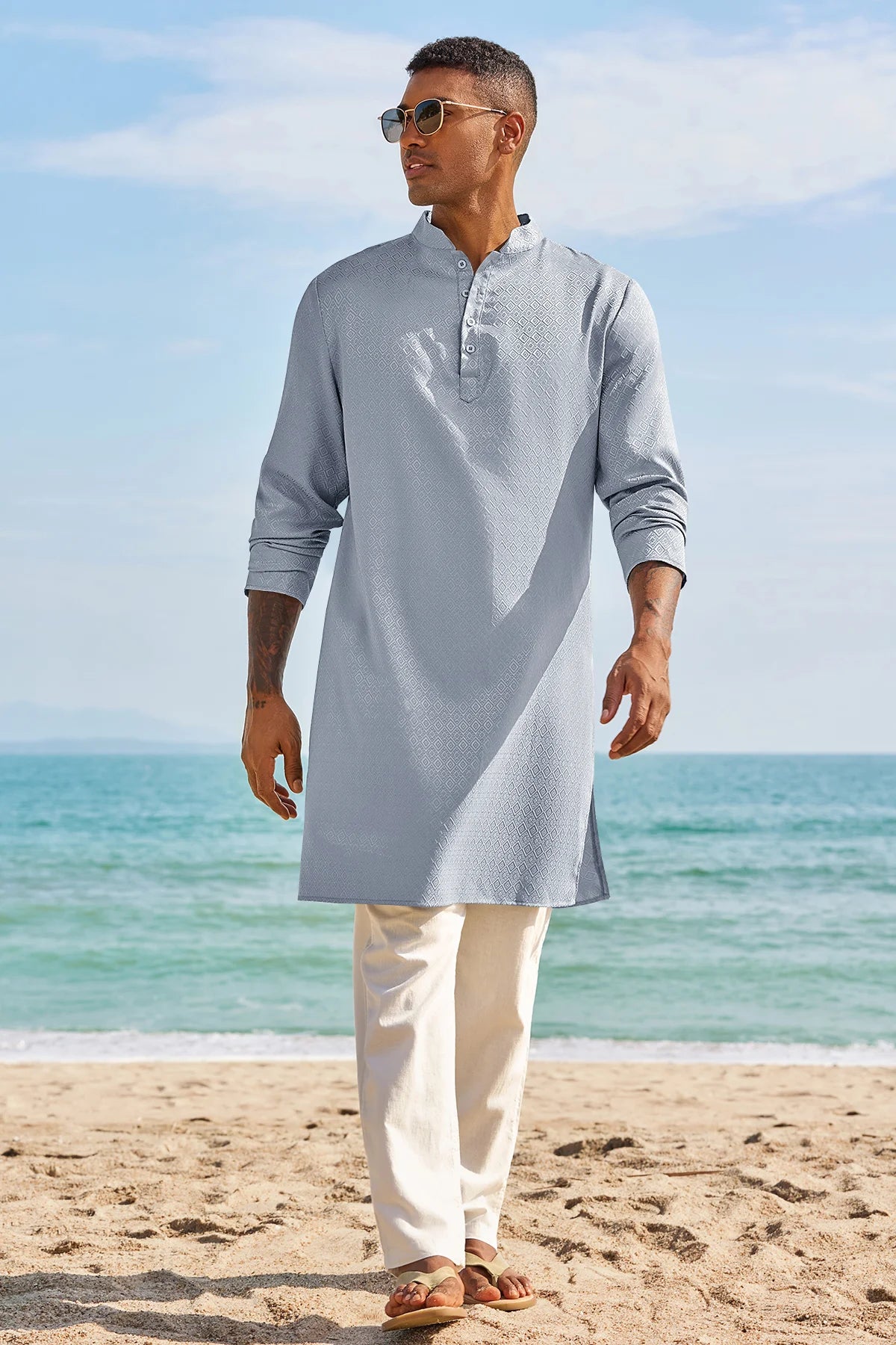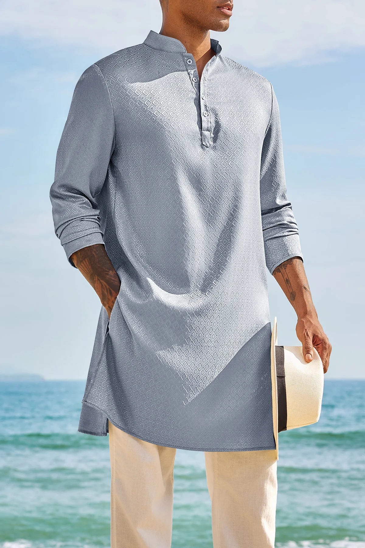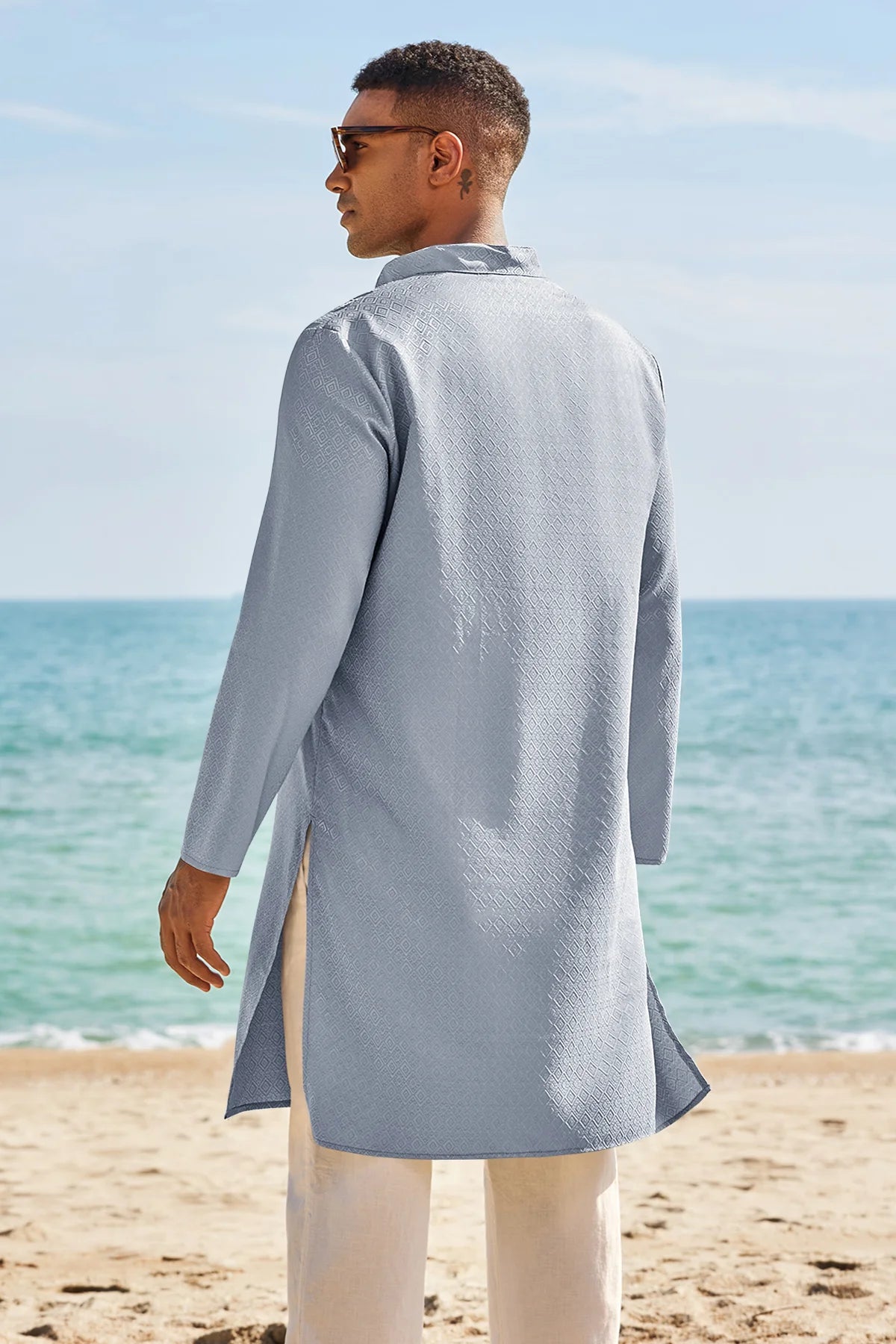 Elevate your wardrobe with Runcati Men’s Long Sleeve Kaftan Robe—blending traditional charm with contemporary comfort. This textured thobe features a Henley neck, banded collar, and loose fit, paired with side splits and knee length for ease of movement. Crafted from 98% polyester and 2% elastane, it’s soft, breathable, and lightweight, ideal for year-round wear.