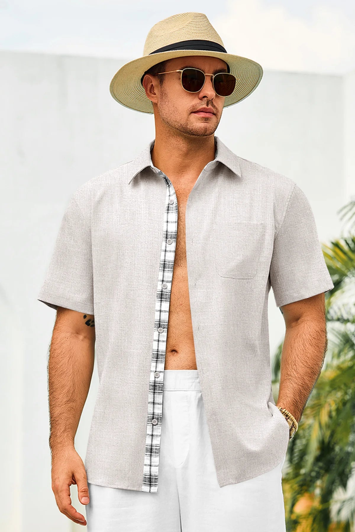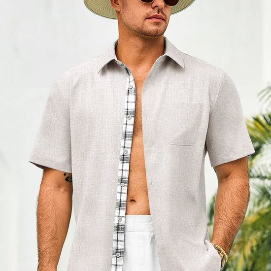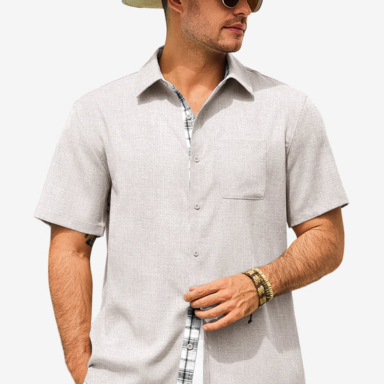 Introducing the mens casual contrasting plaid shirt – a perfect blend of style and comfort! Made from light blens fabric, it’s designed for a relaxed fit with a classic short sleeve, button-down, and spread collar. Featuring unique contrasting plaid design at the collar and placket adds a chic touch, it’s great for weddings or casual beach outings. Available in vibrant colors like Black, White, Sky Blue, and more, this shirt is a must-have for any wardrobe!