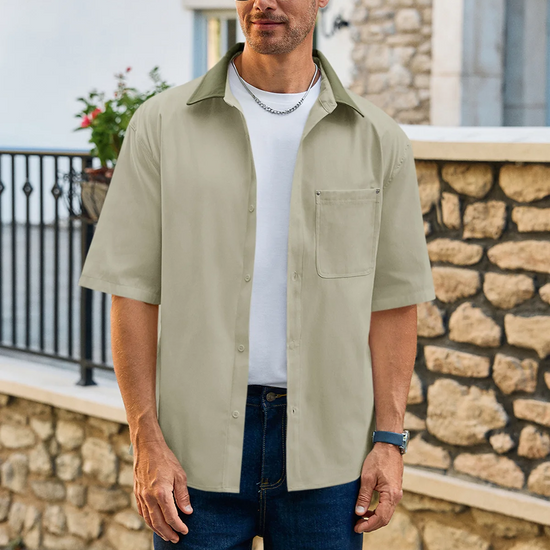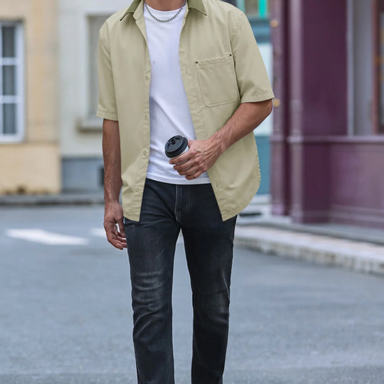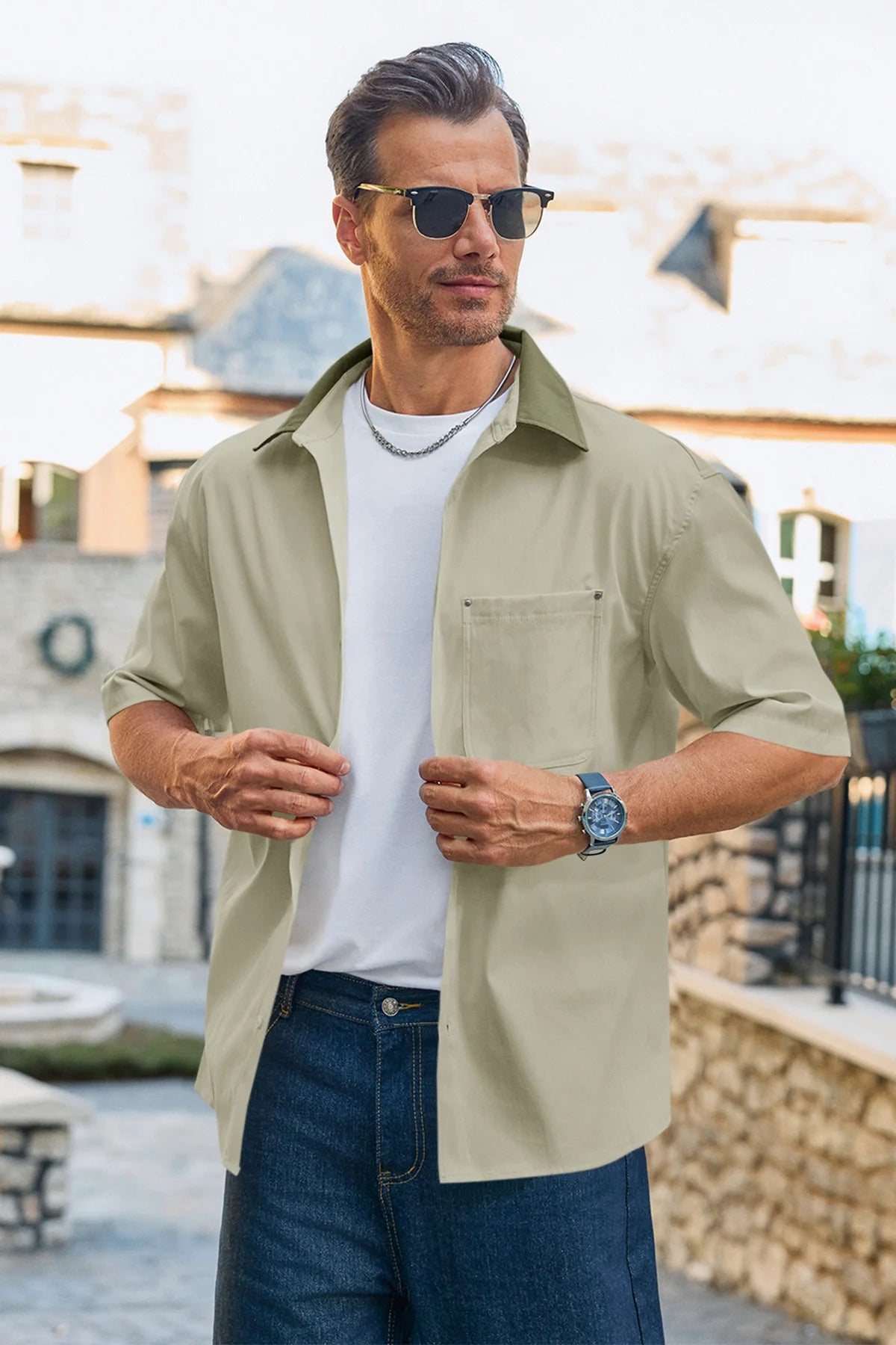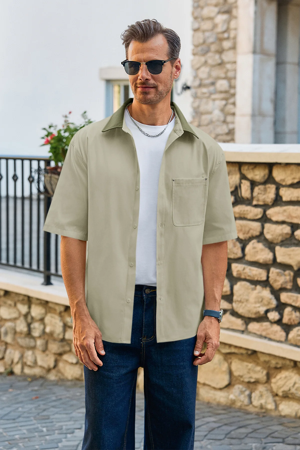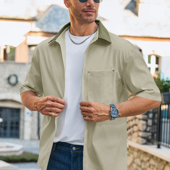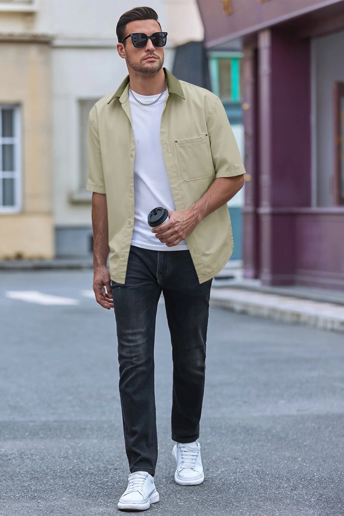 Upgrade your rugged everyday look with the Runcati Mens Button Down Work Shirt. Featuring a unique contrast corduroy lapel and a functional rivet-reinforced chest pocket, this half-sleeve shacket offers a modern twist on classic American workwear. Its loose-fit, tear-resistant design ensures maximum mobility and breathability for any outdoor or urban adventure.