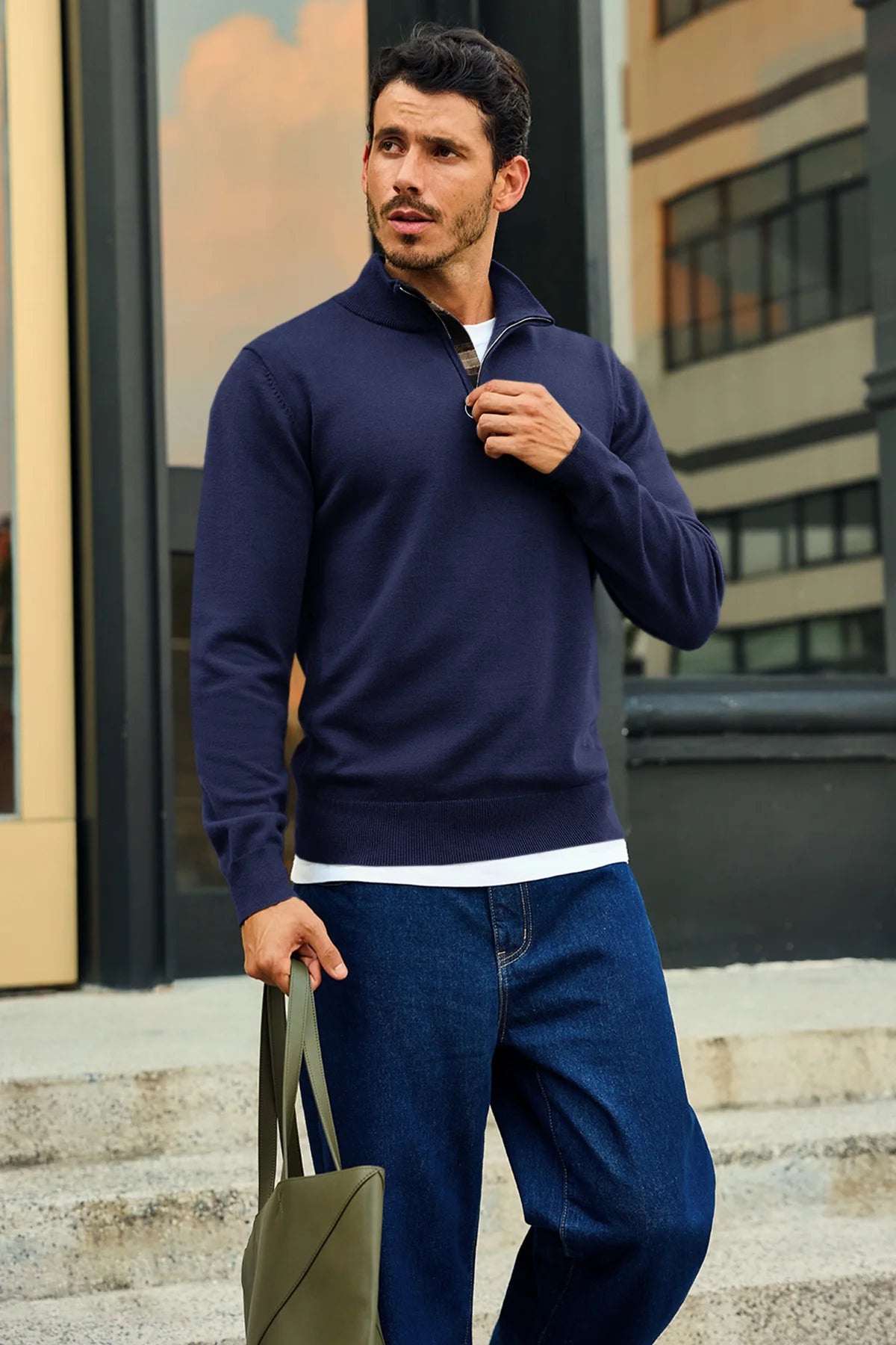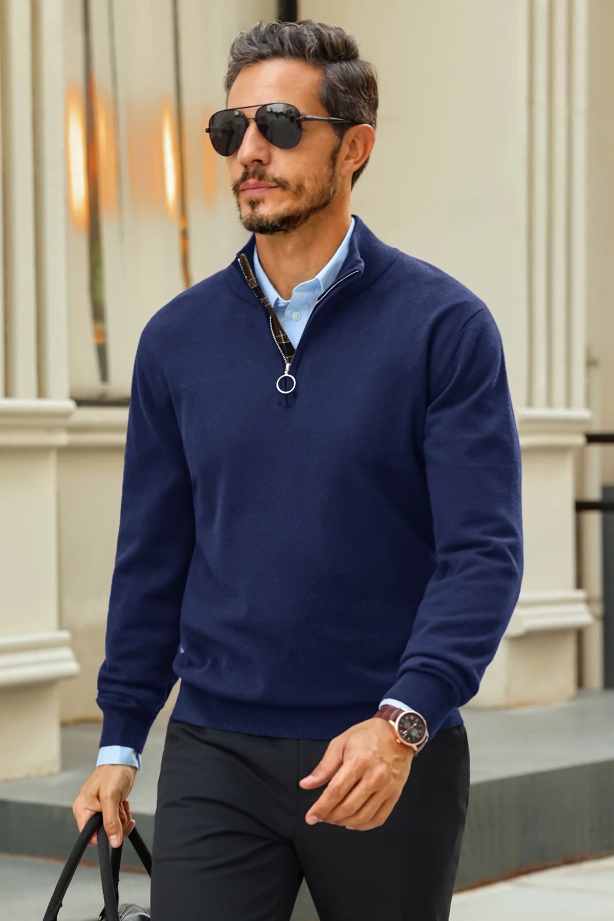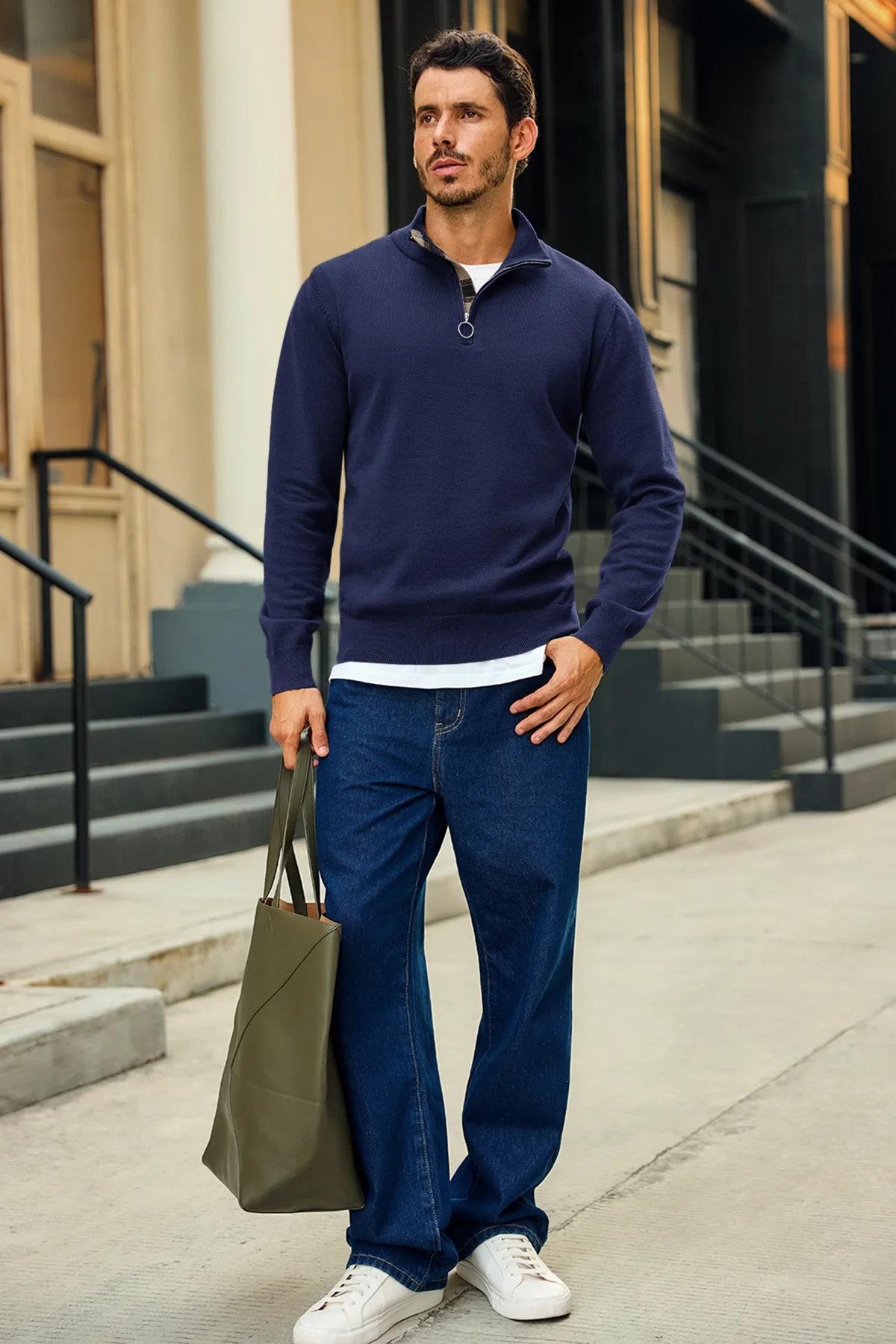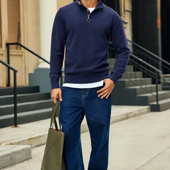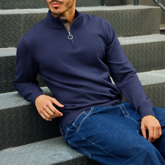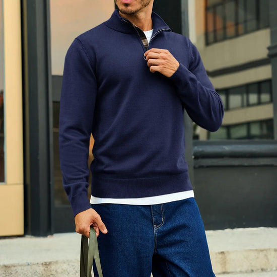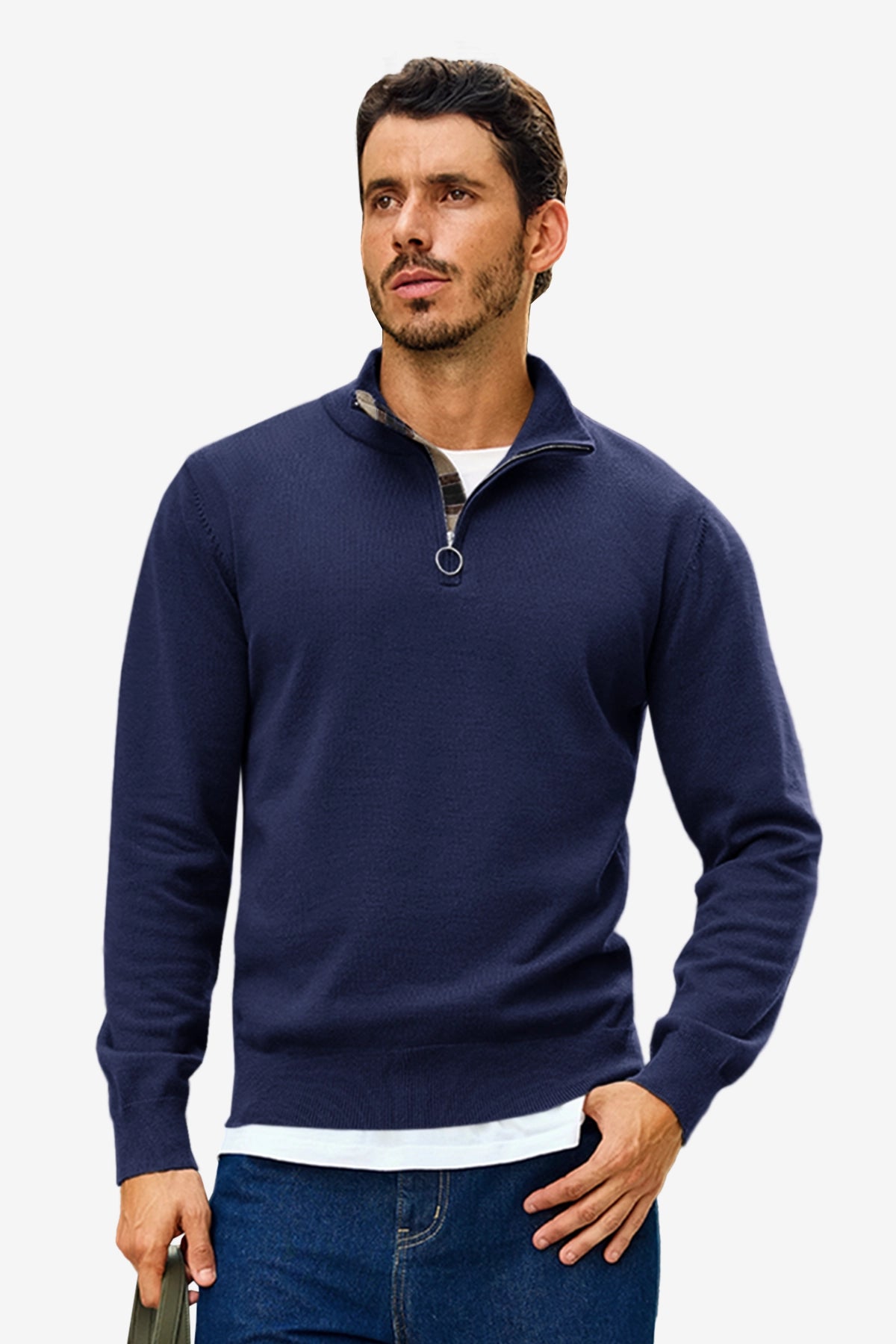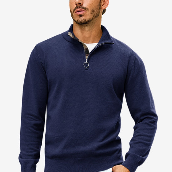 Check out this stylish men's lightweight pullover sweater! With a slim fit, long sleeves, and a half zip mock neck, it’s both comfy and trendy. The unique plaid patchwork collar adds a cool touch. Perfect for casual outings or dressing up over a shirt, it pairs well with jeans or chinos. Made from soft, stretchy fabric, it's warm yet breathable.