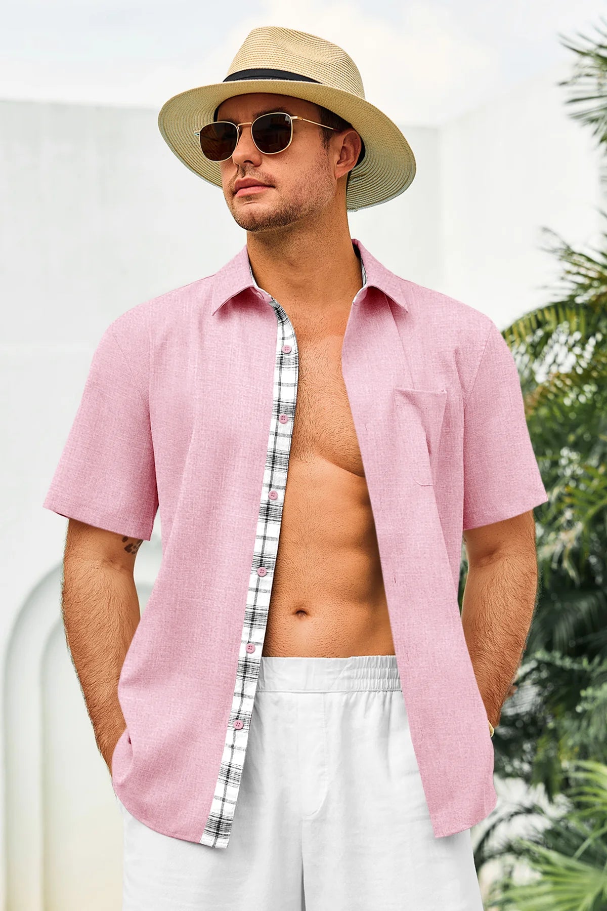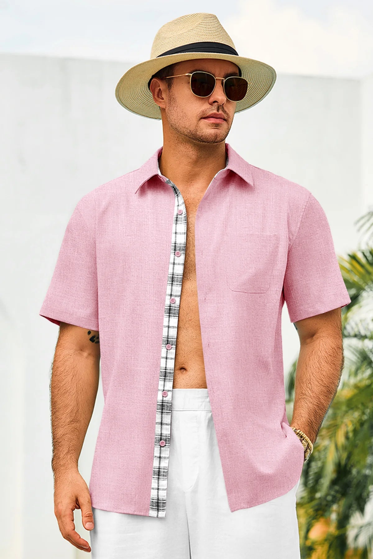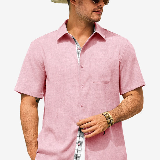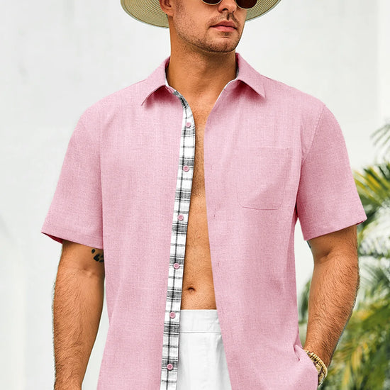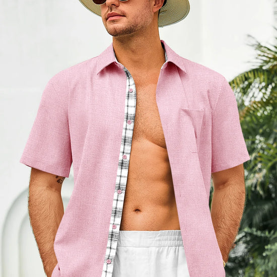 Introducing the mens casual contrasting plaid shirt – a perfect blend of style and comfort! Made from light blens fabric, it’s designed for a relaxed fit with a classic short sleeve, button-down, and spread collar. Featuring unique contrasting plaid design at the collar and placket adds a chic touch, it’s great for weddings or casual beach outings. Available in vibrant colors like Black, White, Sky Blue, and more, this shirt is a must-have for any wardrobe!