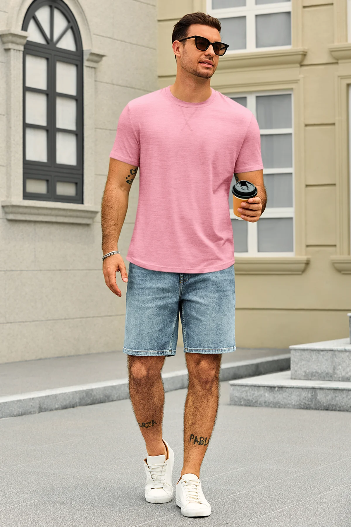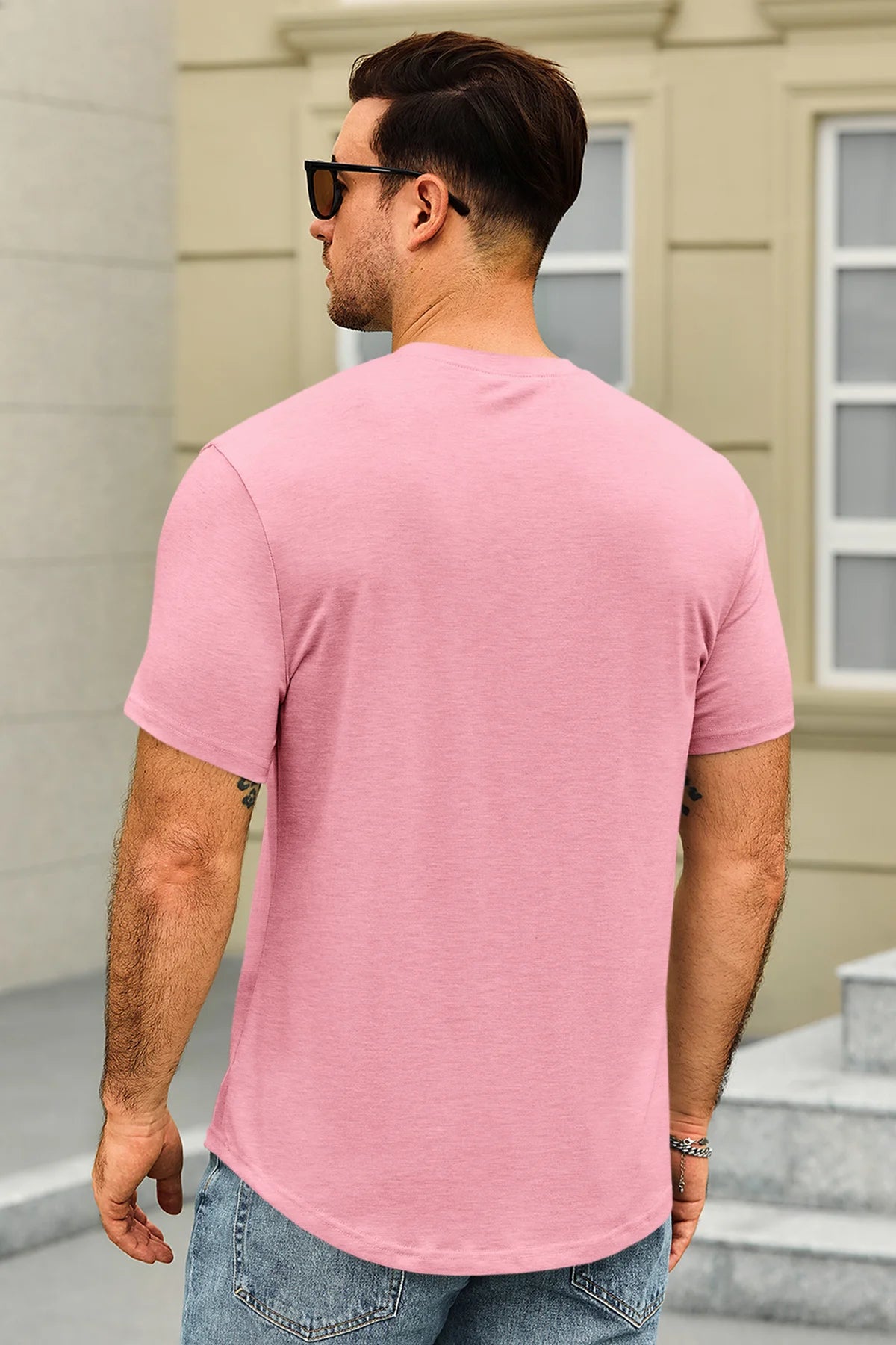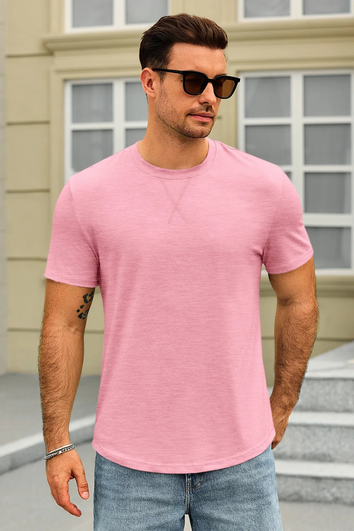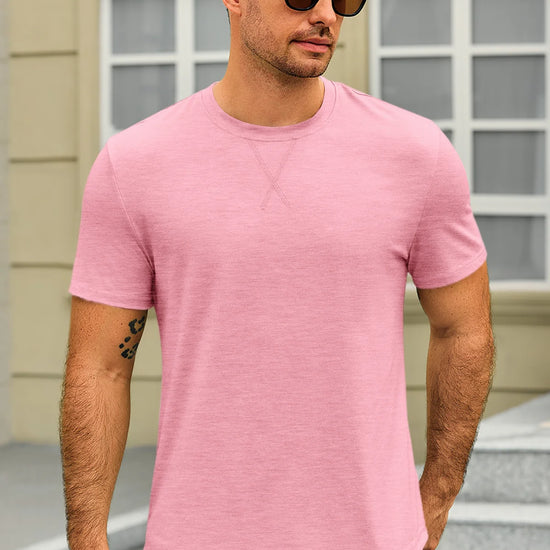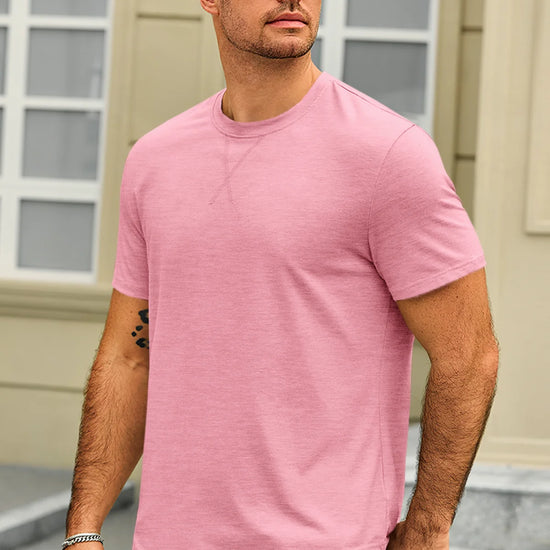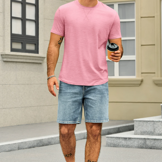 Classic men's short sleeve tee with a crew neck and curved hem. Made from lightweight stretch fabric for a comfortable, regular fit that retains its shape. Versatile for dressing up or down, perfect for casual outings, parties, or daily wear. A timeless, solid-color essential for any wardrobe. Check the size chart before ordering.