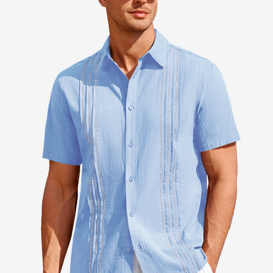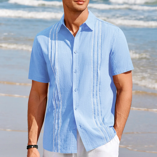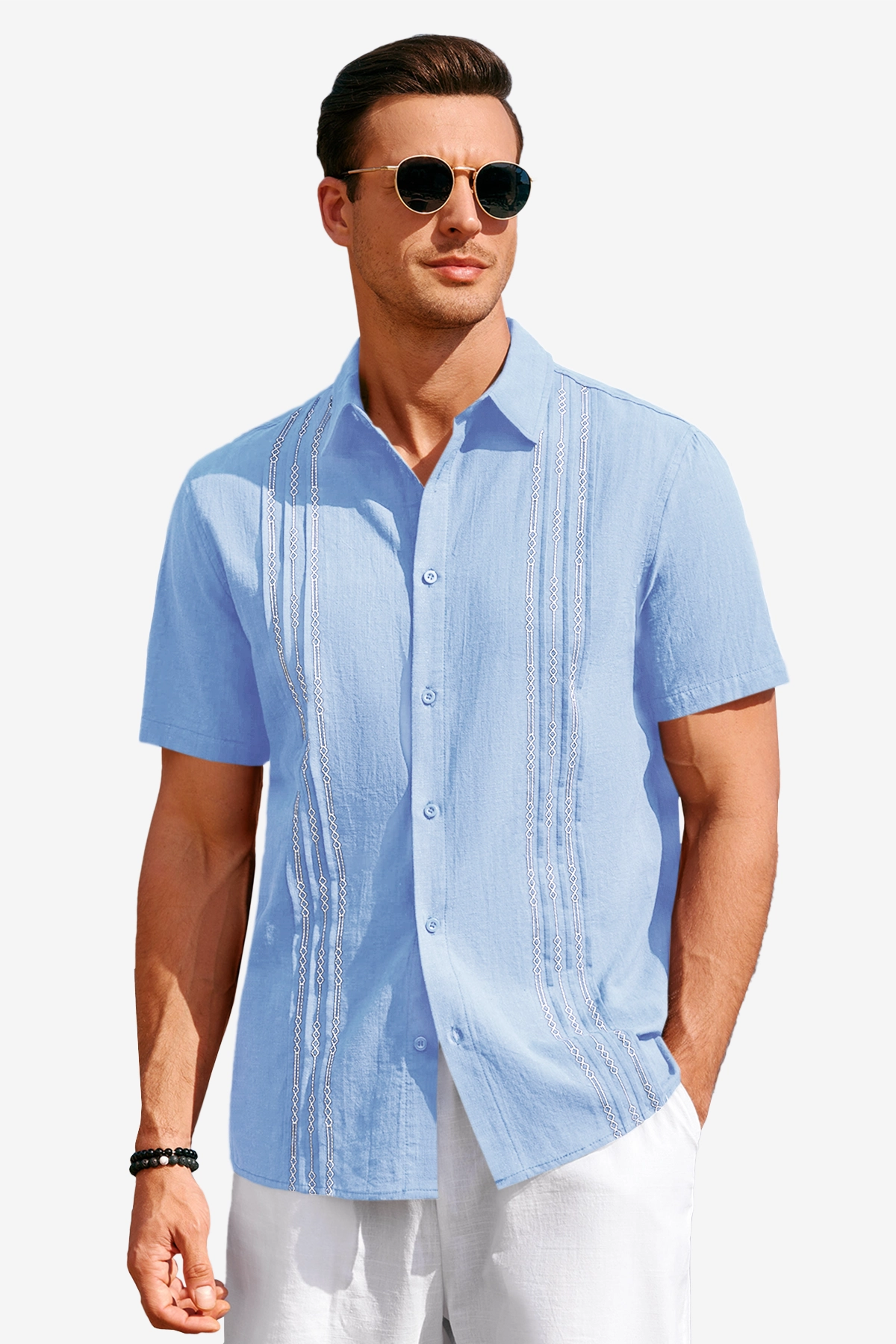 Introducing the Easy Fit Mexican Guayabera shirt – a perfect blend of style and comfort! Made from light linen cotton, it’s designed for a relaxed fit with a classic short sleeve, button-down, v-neck, and spread collar. Featuring elegant embroidery on the sides, it’s great for weddings or casual beach outings. Available in vibrant colors like Black, White, Sky Blue, and more, this shirt is a must-have for any wardrobe!