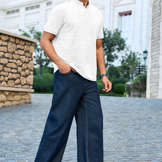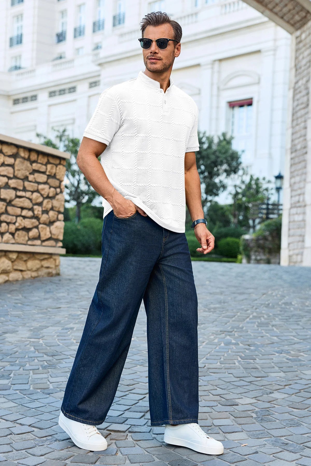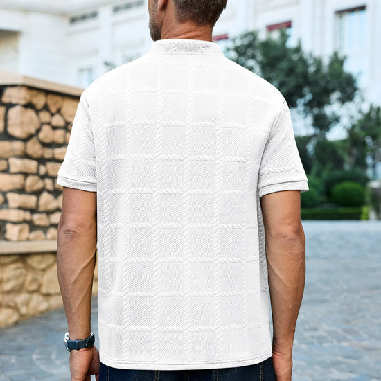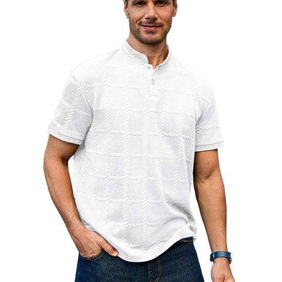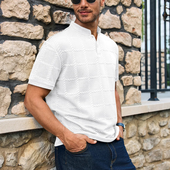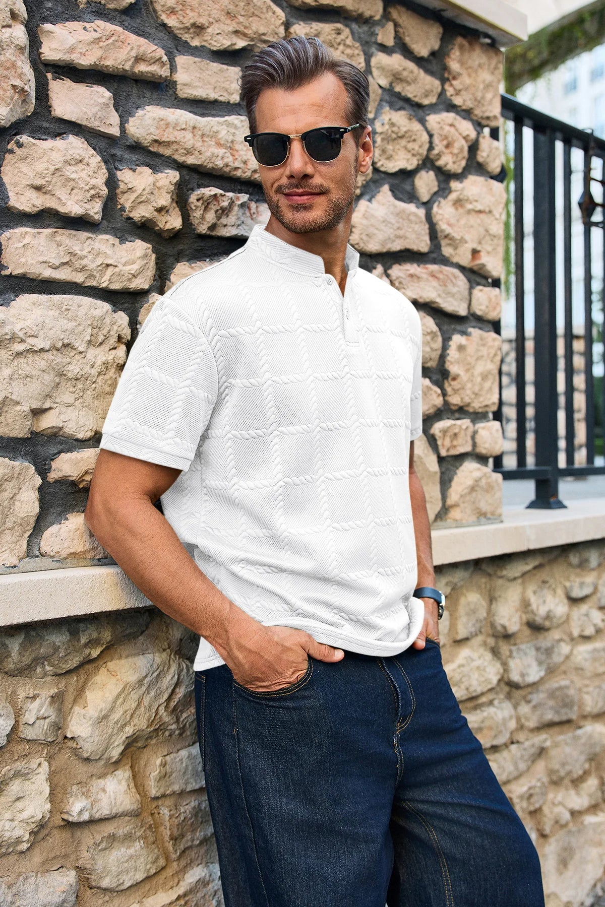 Elevate your smart-casual rotation with this Runcati men’s textured Henley shirt. Featuring a sophisticated plaid jacquard knit and a sleek stand collar, this polo alternative offers a refined, modern silhouette. Perfectly balanced between business-casual and weekend-ready, its wrinkle-free fabric ensures you maintain a polished, professional look from the office to the airport.