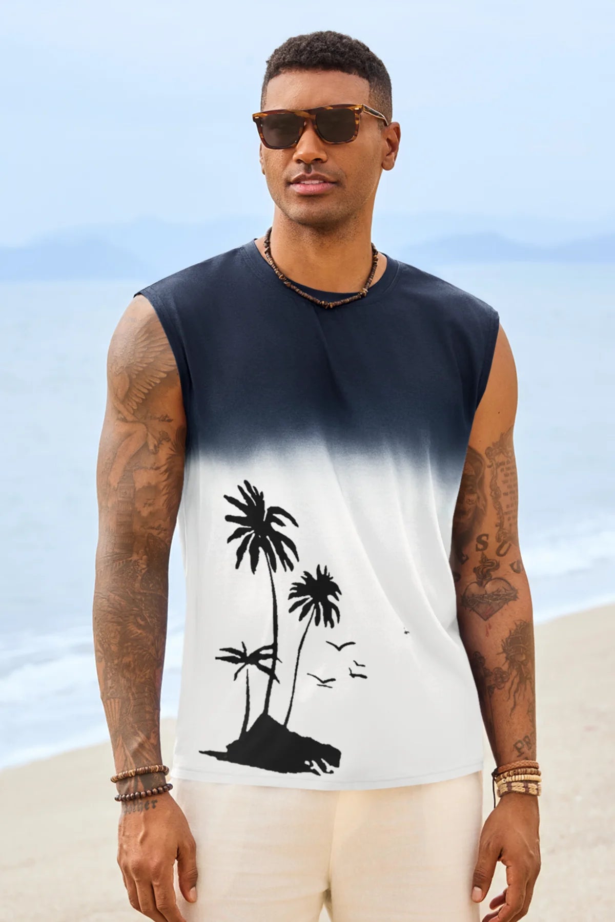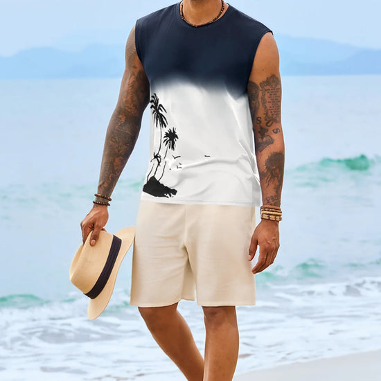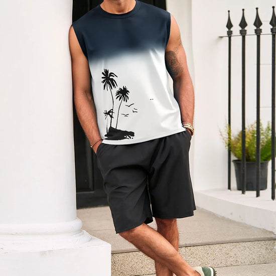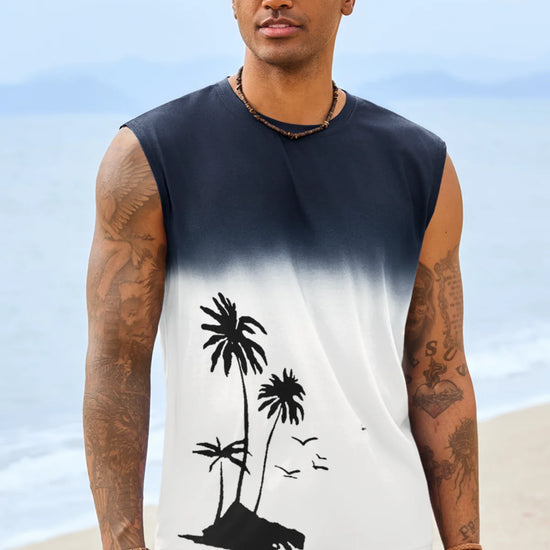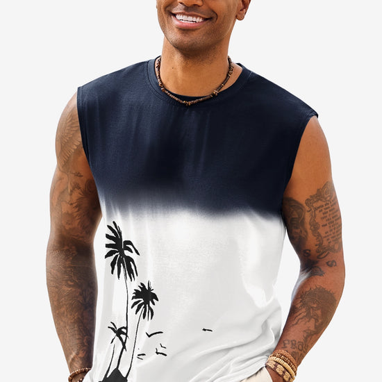 Elevate your summer vibe with this Runcati men's graphic tank top. Featuring a striking palm tree gradient print, this sleeveless shirt blends retro Hawaiian aesthetics with a modern muscle fit. Whether you're hitting the gym or heading to a beach bonfire, its moisture-wicking fabric ensures you stay cool, dry, and stylish under the sun.