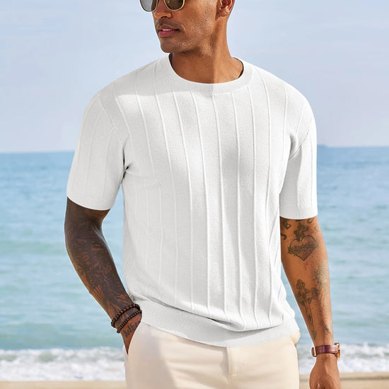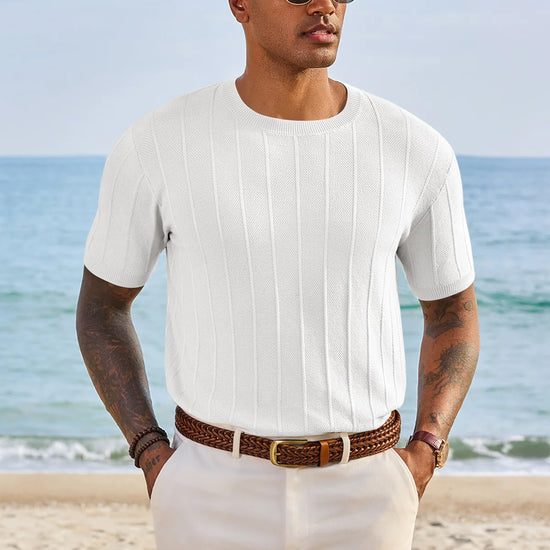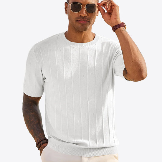Classic crewneck and short sleeve design with a ribbed textured finish for subtle dimension.