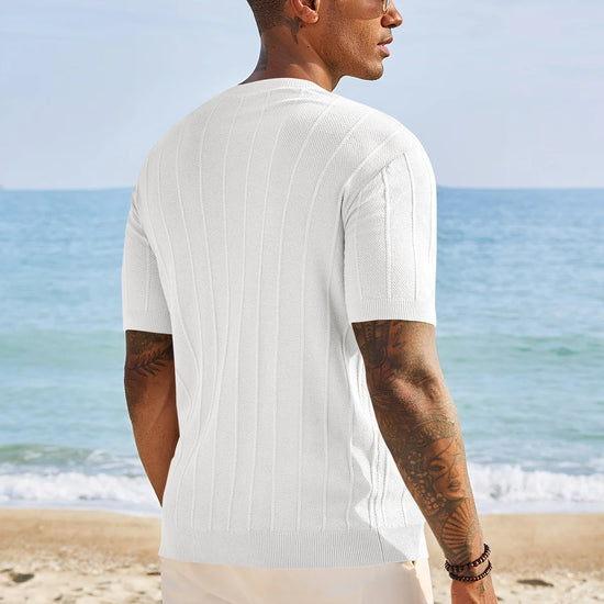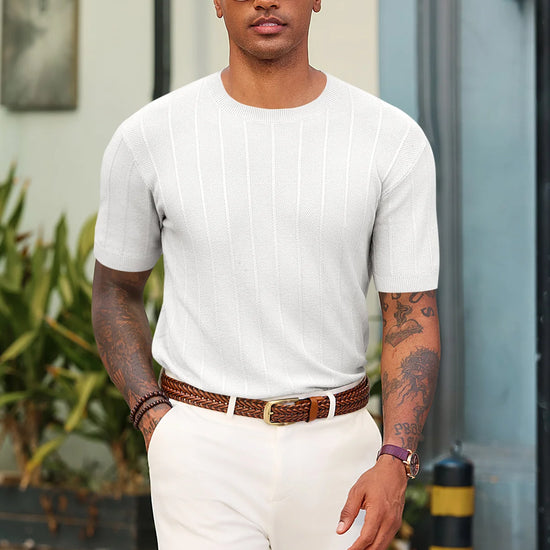 Elevate your wardrobe with Runcati Men’s Knit Short Sleeve Crewneck Tees—crafted for timeless style and all-season comfort. Featuring a ribbed textured design, regular fit, and classic solid color, this stretch pullover blends casual charm with versatile appeal. Soft, breathable viscose-polyamide fabric ensures all-day wearability, perfect for office days, beach outings, dates, or daily casual looks.