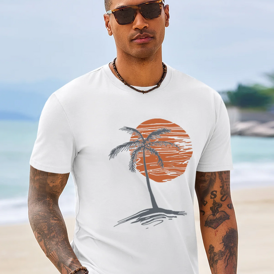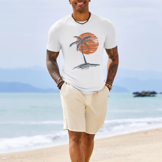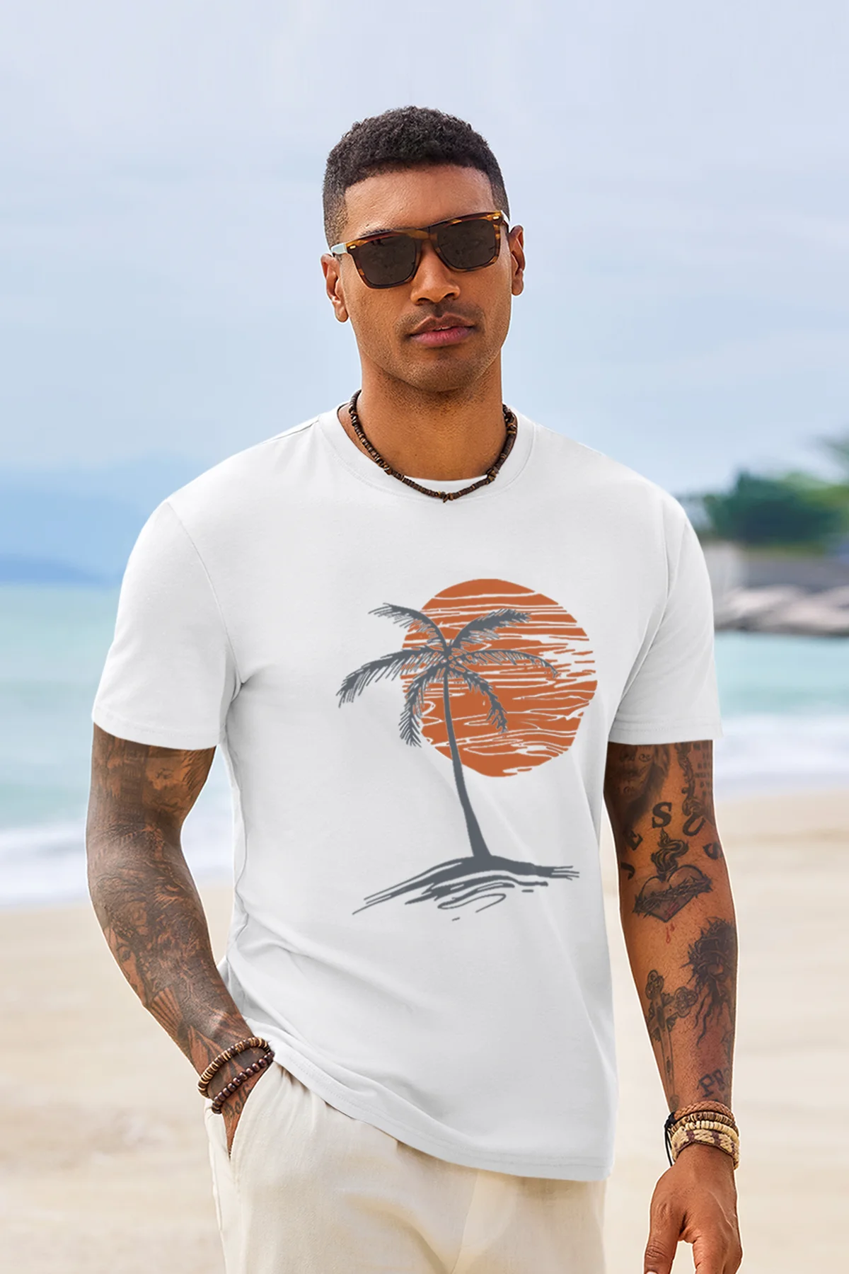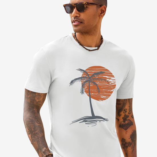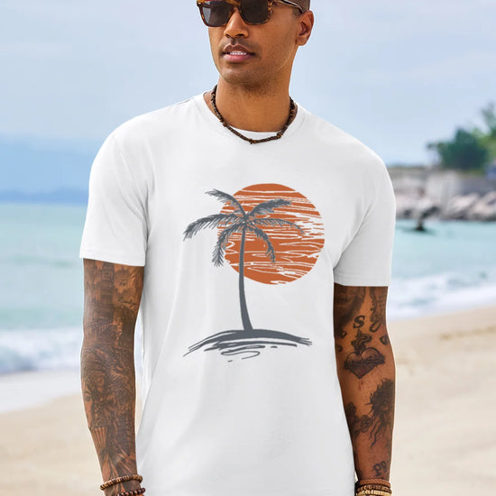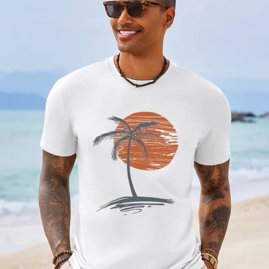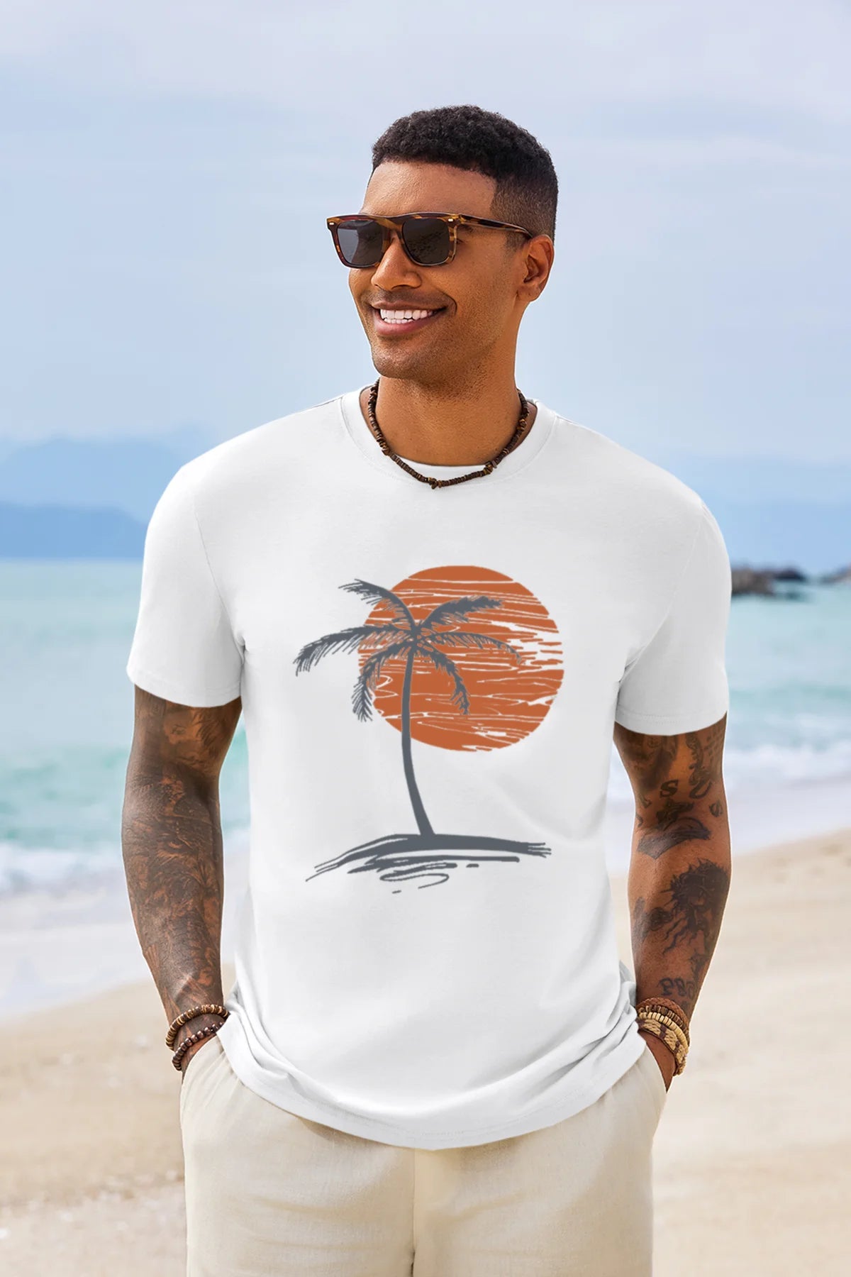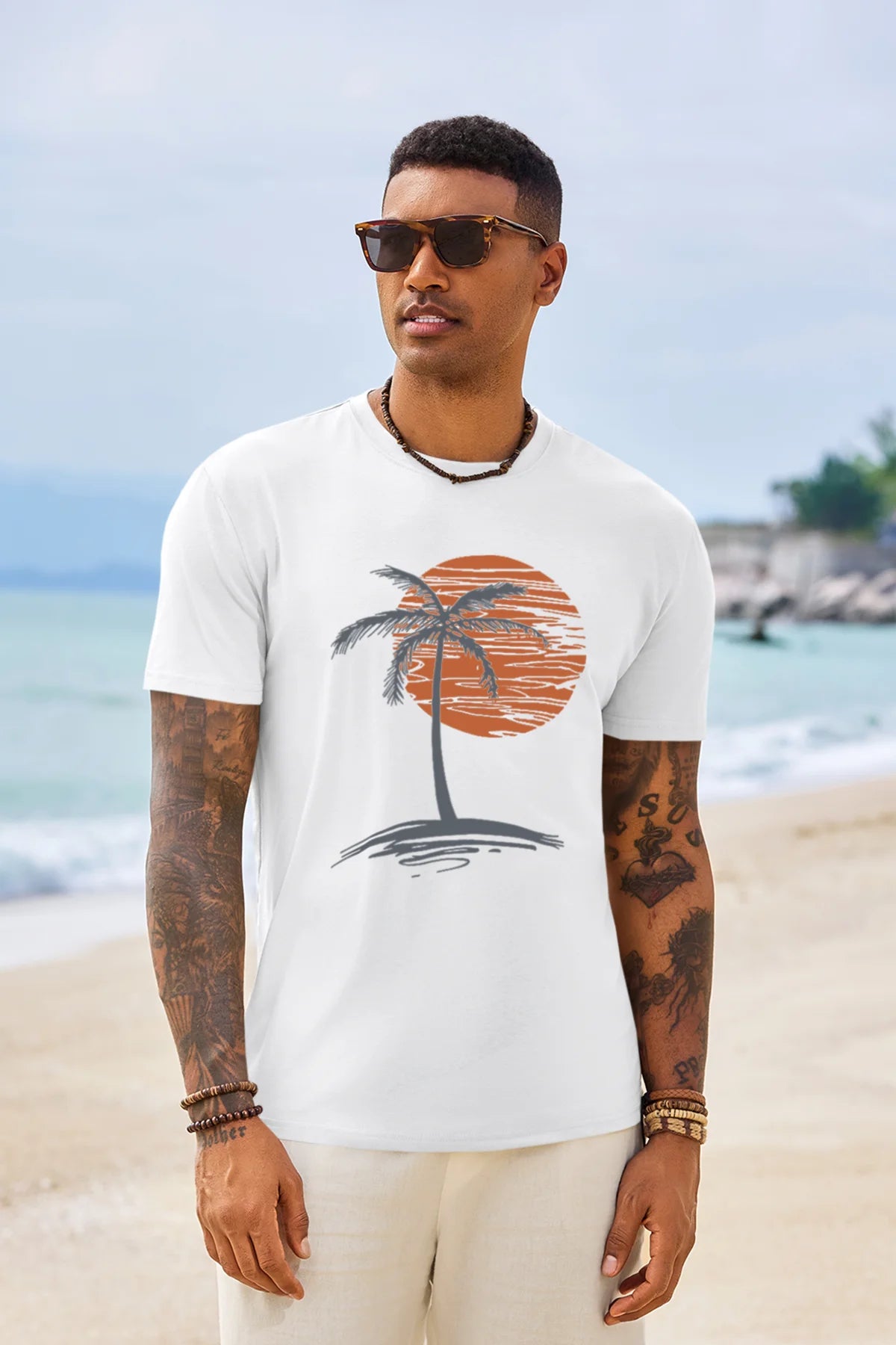 Add a tropical vibe to your wardrobe with this Runcati Mens Short Sleeve T-Shirt. It features a classic crew neck design and a stylish sunset palm tree print on the chest—simple yet atmospheric. The basic fit accommodates various body types, making it suitable for both casual wear and sports activities.Easy to pair with shorts, joggers, or jeans, it effortlessly creates a stylish casual look. Perfect for the beach, camping, workouts, daily outings, and other versatile occasions, while maintaining color and shape well after washing.
