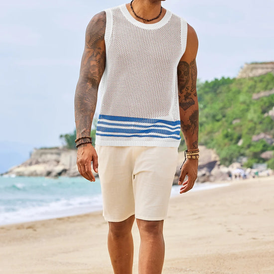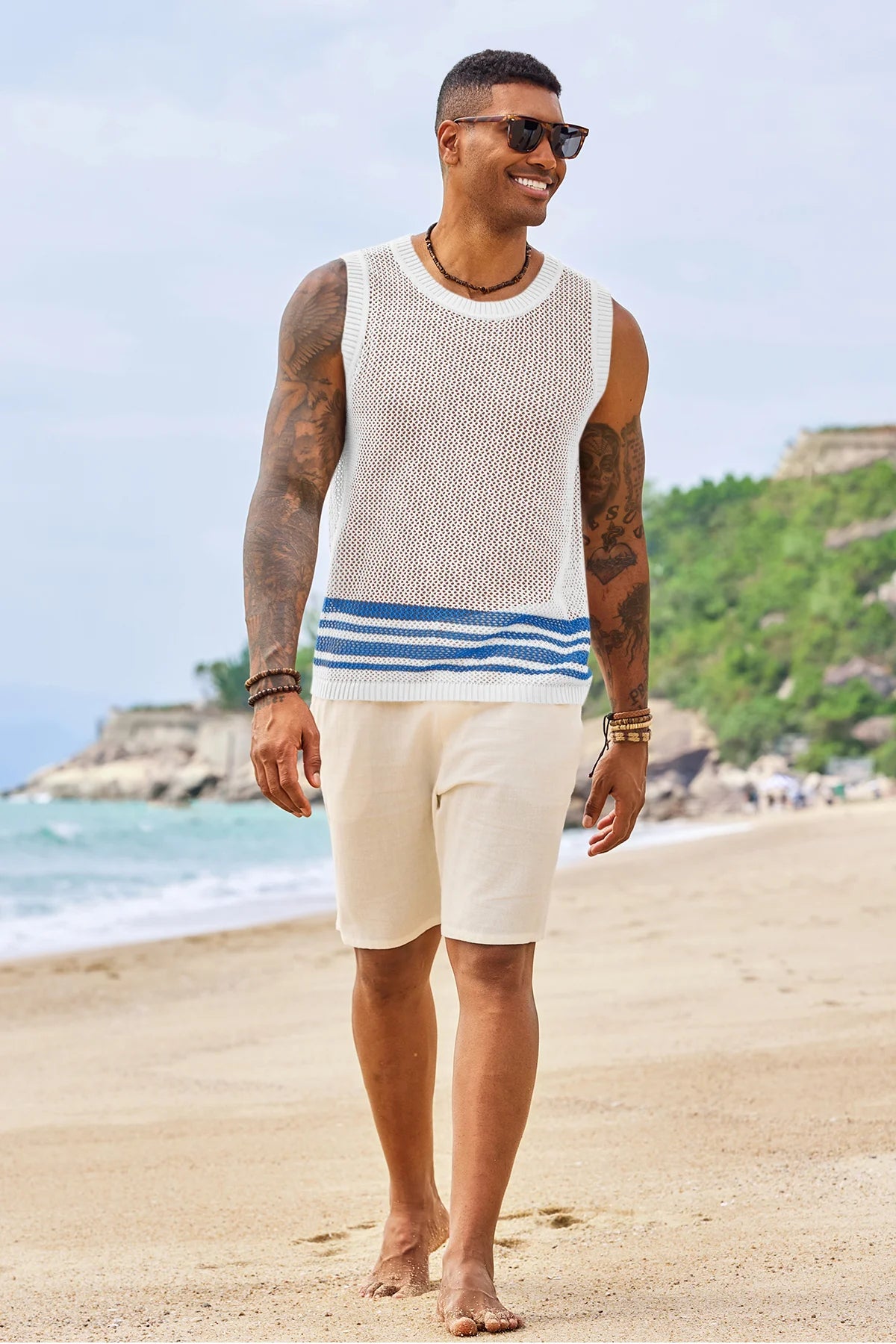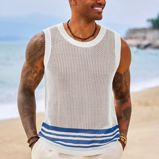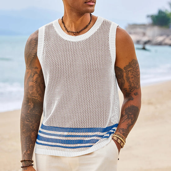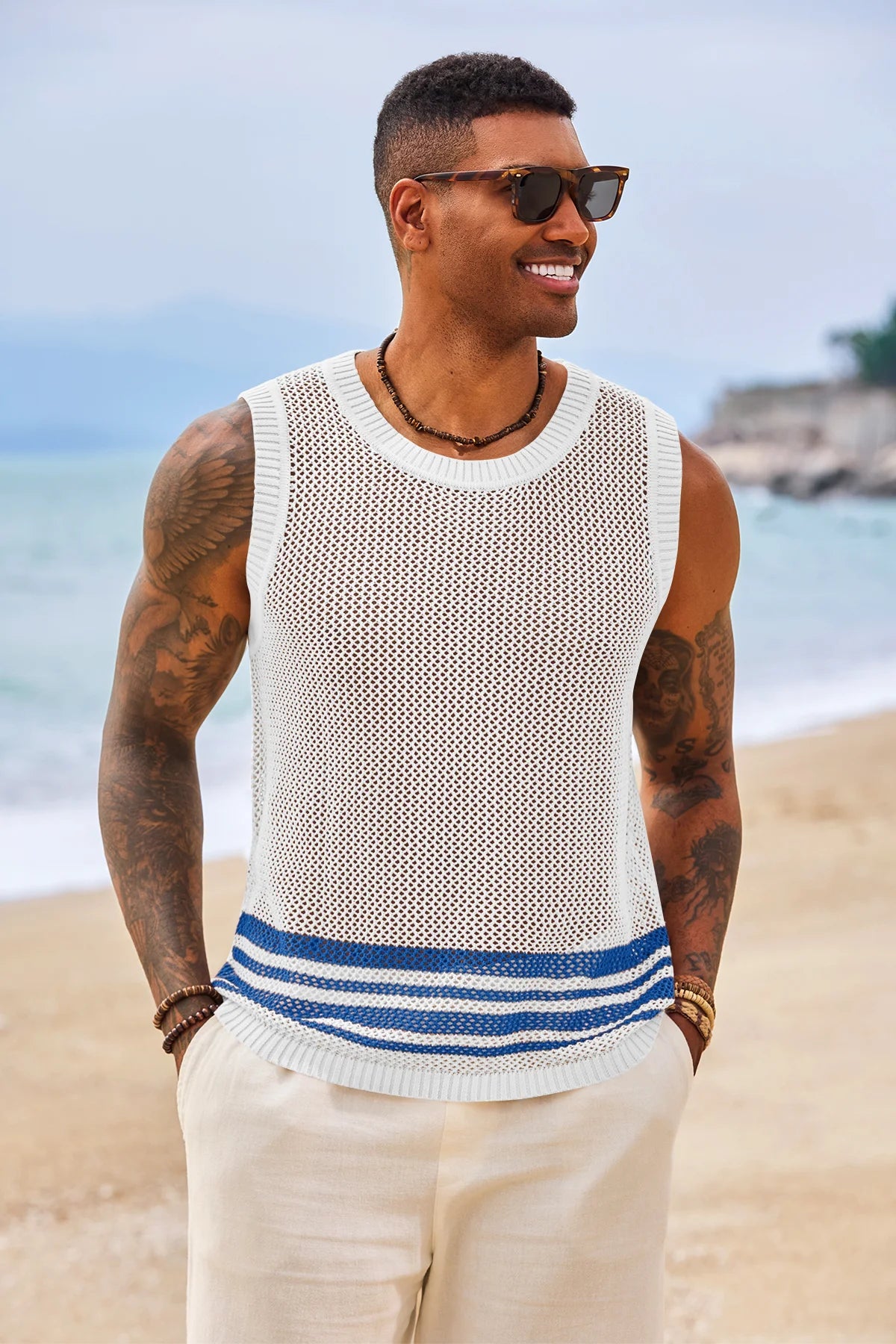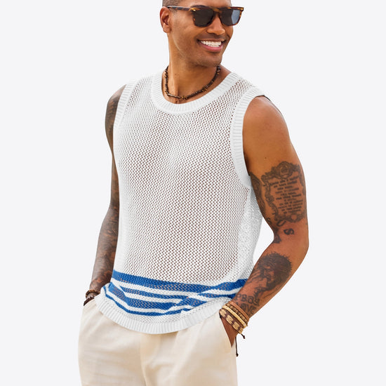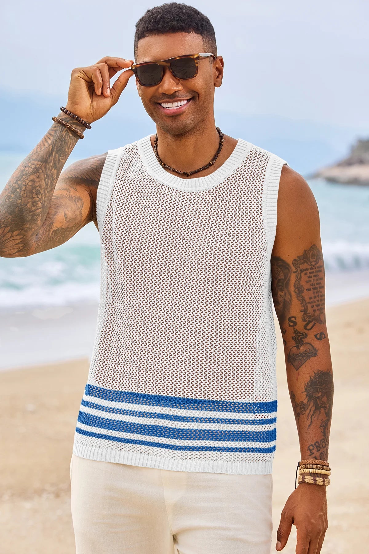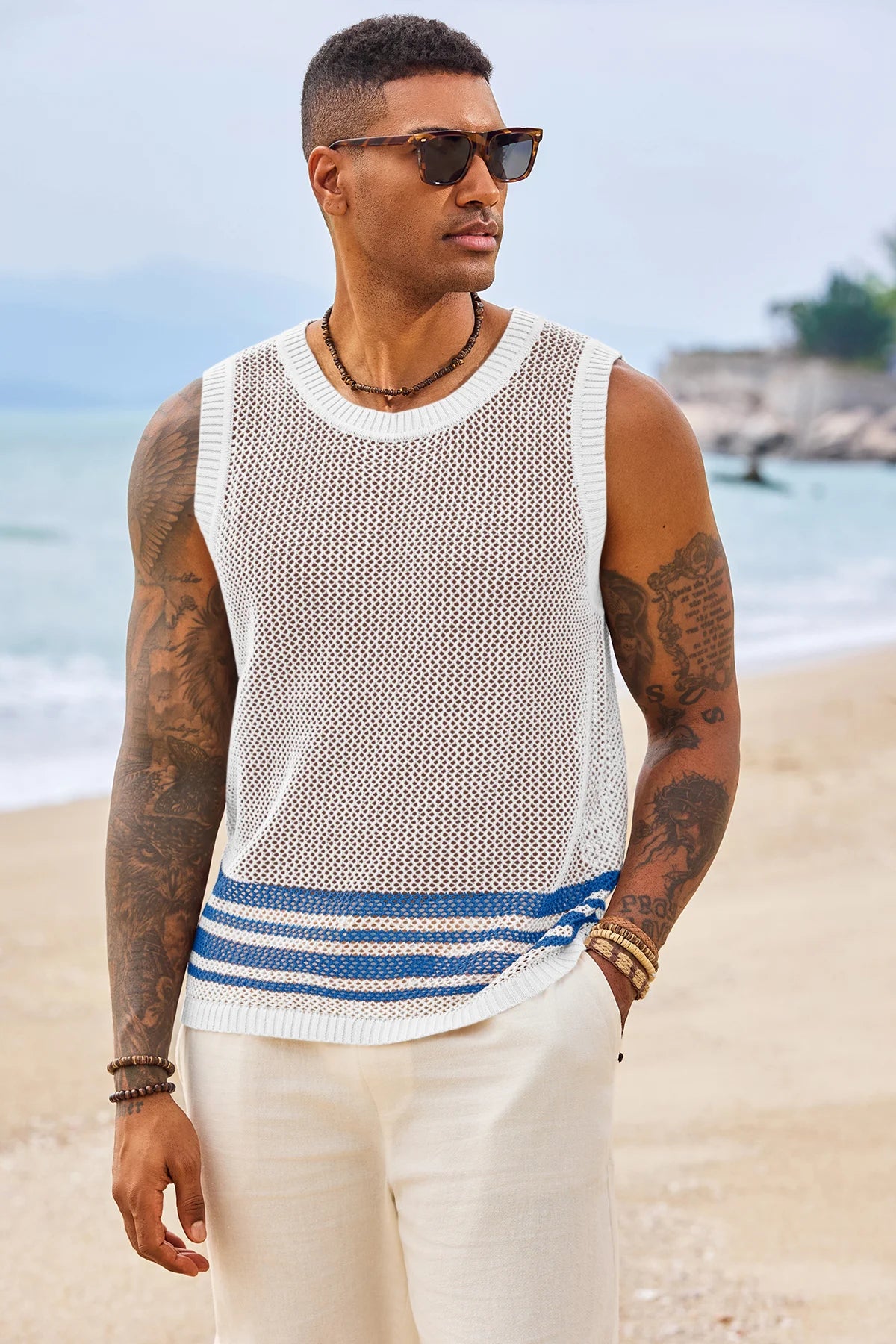 Elevate your summer style with Runcati Men’s Crochet See-Through Tank Tops—crafted for beach days and streetwear vibes. This sleeveless crew neck top features a hollow knit design to showcase muscle lines, color-blocked hem for trendy flair, and breathable fabric for all-day coolness. Perfect for beach parties, casual outings, or hip-hop looks, it pairs effortlessly with shorts or jeans for a laid-back hippie aesthetic.