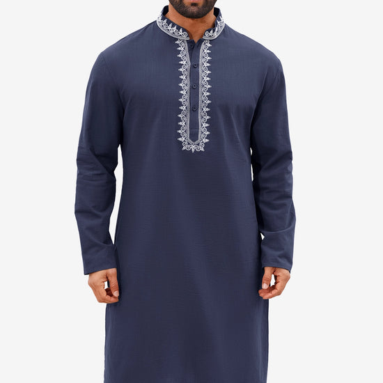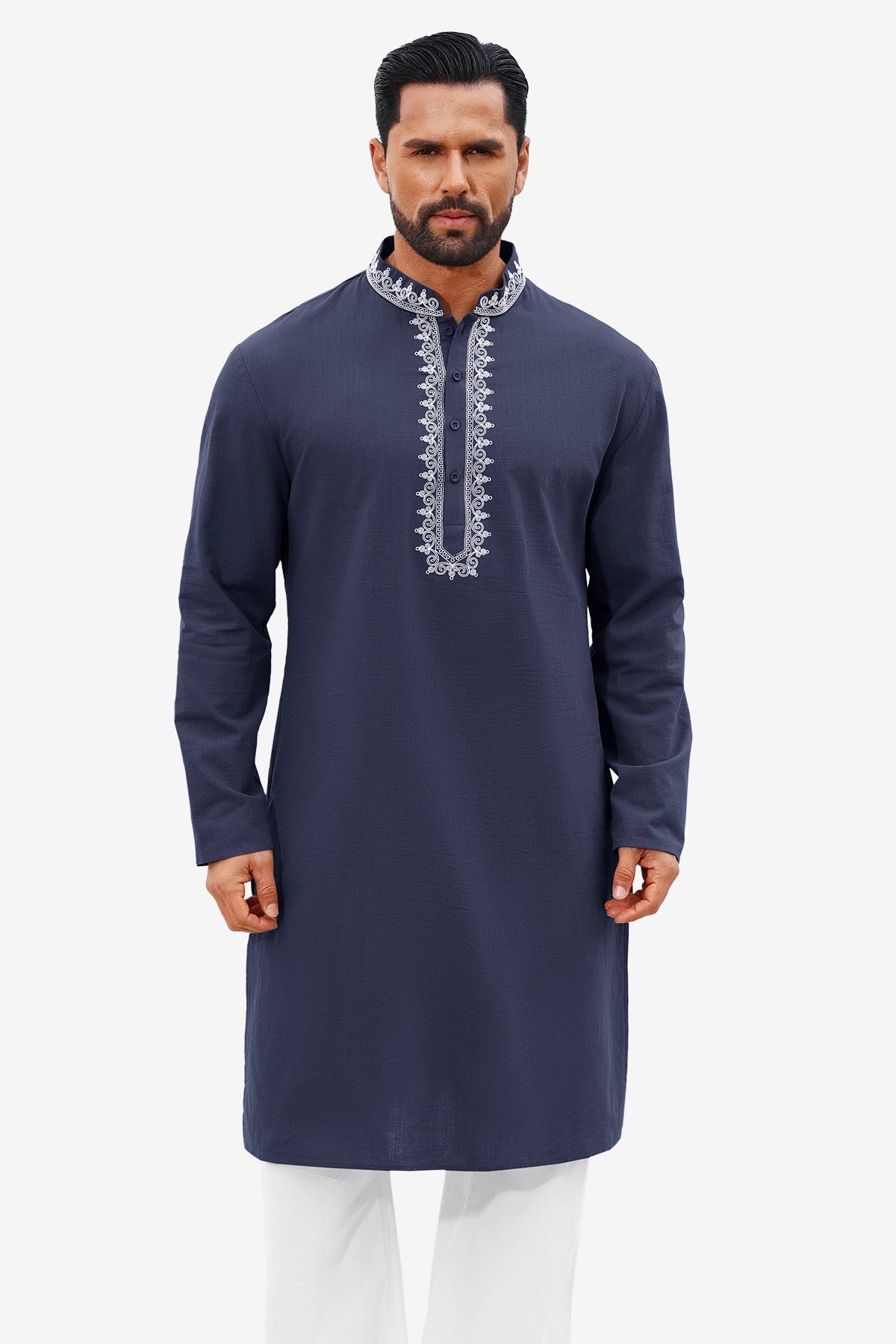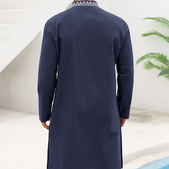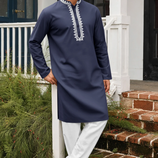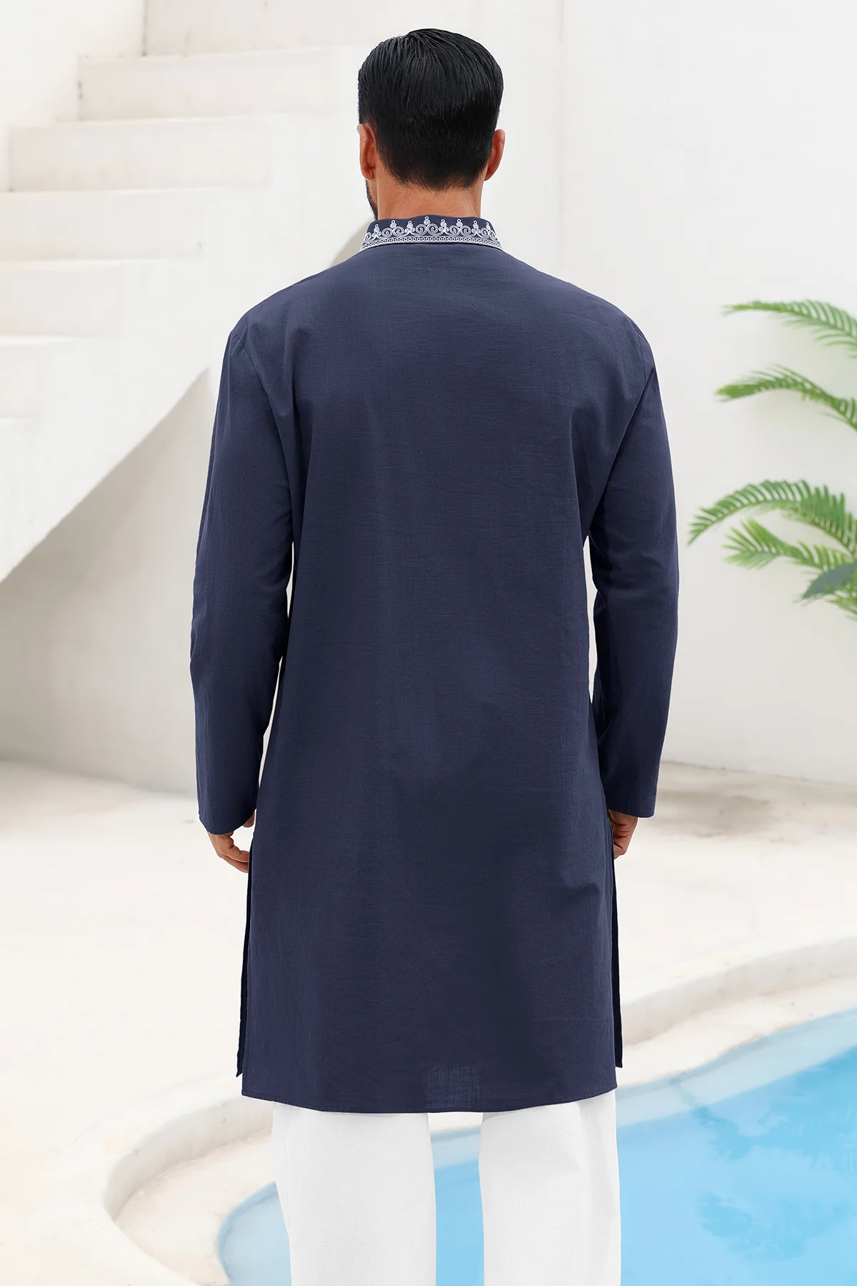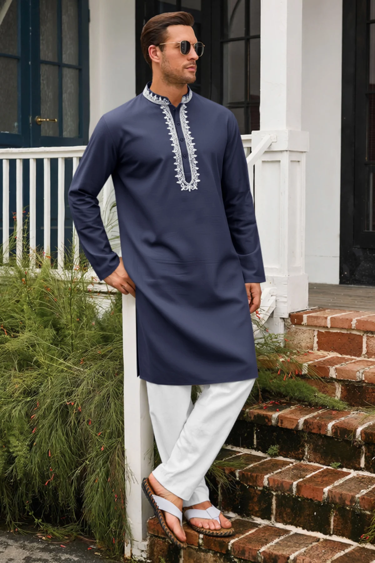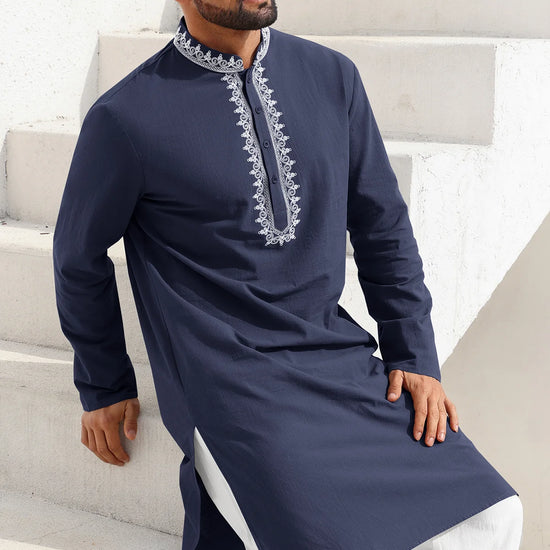 Runcati men’s vintage kaftan thobe blends timeless style with all-season comfort! Designed with a banded collar, long sleeves, elegant embroidery on a solid color base, knee-length cut, side splits, and a relaxed loose fit, it offers versatility and classic sophistication. Crafted from high-quality cotton, it’s soft, breathable, lightweight, and durable—perfect for spring, summer, fall, and winter wear. Easy to style for any occasion, it’s a versatile addition to your wardrobe.